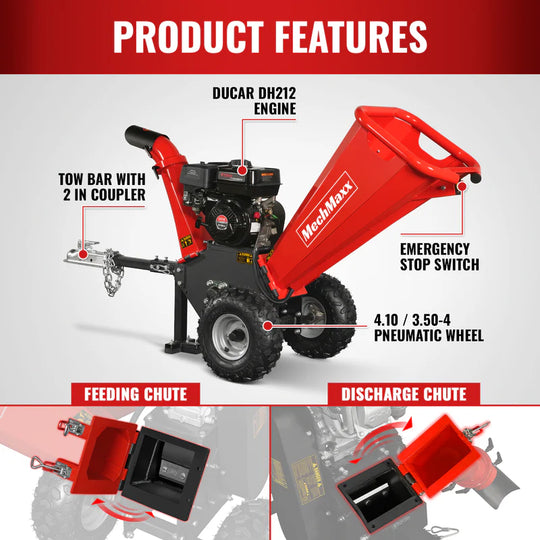 MechMaxx 4 inch DUCAR 212cc 7hp Gas Engine Powered Wood Chipper with Towbar, GS650