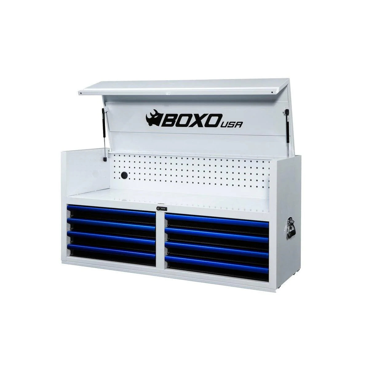 The 53" 8-Drawer top chest has a choice of red, blue, or orange* anodized drawer trim pulls. The drop front lid with full length piano hinge is actuated by two heavy-duty gas struts. Included is a full width square hole back panel for accessory holders (sold separately). Protect your tools with the key lock or digit-lock combination locking system. Full extension drawers come with 100 lbs. steel ball bearing drawer slides. Each box comes with a foam drawer liner kit. Available in either white with black drawers or black with grey drawers. Every Pro Series tool box features a lifetime warranty.