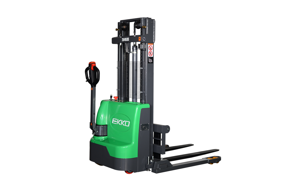 The EKKO EB12E-98Li LITHIUM IRON PHOSPHATE Electric Straddle Stacker with a 72" lowered mast can get underneath any doorway and is designed with the combination of the versatility of a forklift, reach truck and a walkie stacker. It is ideal for loading and unloading trucks, loading docks, stock rooms, manufacturing floors and warehousing.