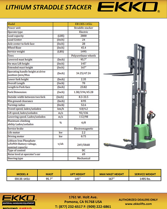 EKKO EB13E-145Li Lithium Straddle Stacker 2800 lb Cap., 145" Height