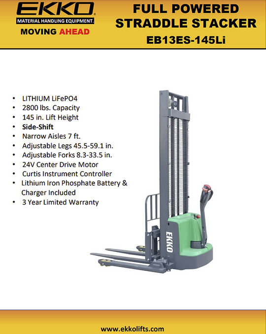 EKKO EB13ES-145Li Lithium Straddle Stacker 2640 lb Cap., 145" Height, Side Shift