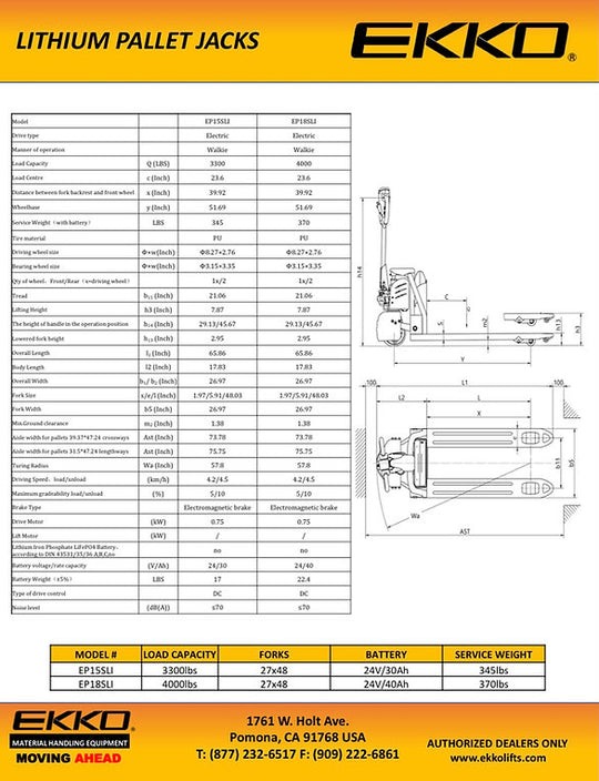 The EKKO EP18JLi Lithium Iron Phosphate Electric Walkie Pallet Jack is designed with the versatility of a pallet jack with full power lifting and driving capabilities. It is ideal for loading and unloading trucks, loading docks,...Regular price $2,888.00Regular price $2,888.00 -