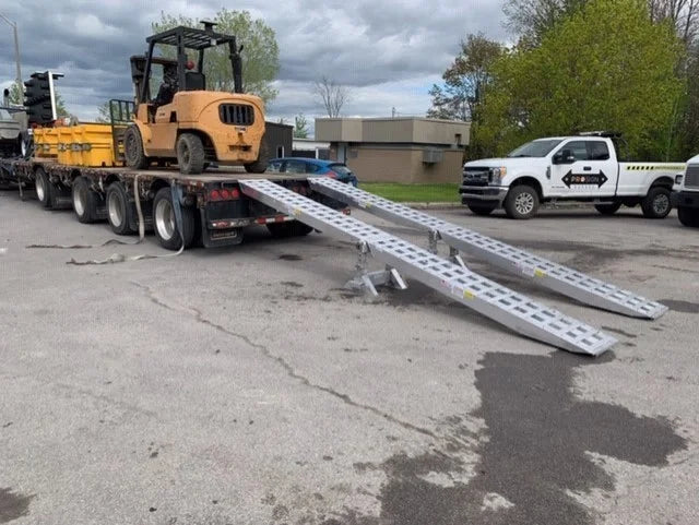 The step deck trailer ramp is the most versatile ramp system for loading tractors, loaders, trucks, and heavy equipment onto step deck trailers, loading docks, or flatbed trailers. These high-strength, lightweight aluminum ramps are easy to set up, and have a 23,500 lb. per axle weight capacity.