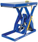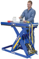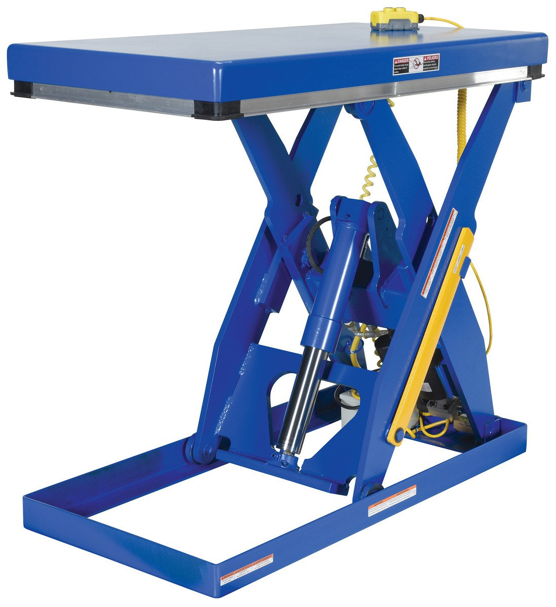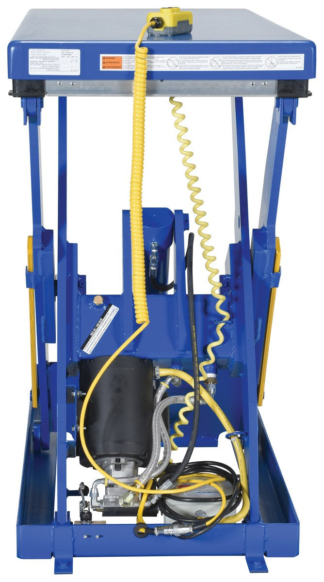 The electric hydraulic scissor lift table is used by all types of manufacturing and warehouse facilities. Safety features include a patented pinch point perimeter toe guard to protect pinch points while lowering the table, a fused push button control, an internal safety velocity fuse to maintain platform height in an event of hose or fitting failure, an integral maintenance prop, an adjustable upper travel limit switch to stop the table at maximum height, and displacement-style hydraulic cylinders for maximum strength. It also features a pressure plated pump, manifold system, and state-of-the-art lifetime lubricated bearings. The standard 56 frame electric motor is fully enclosed with additional voltage options available. Contact factory if platform dimensions are crucial.