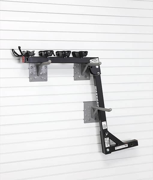 Using multiple of these brackets, it is possible to get a heavy bike rack off the floor of a garage and store it safely on slatwall! Even the heaviest of bike racks